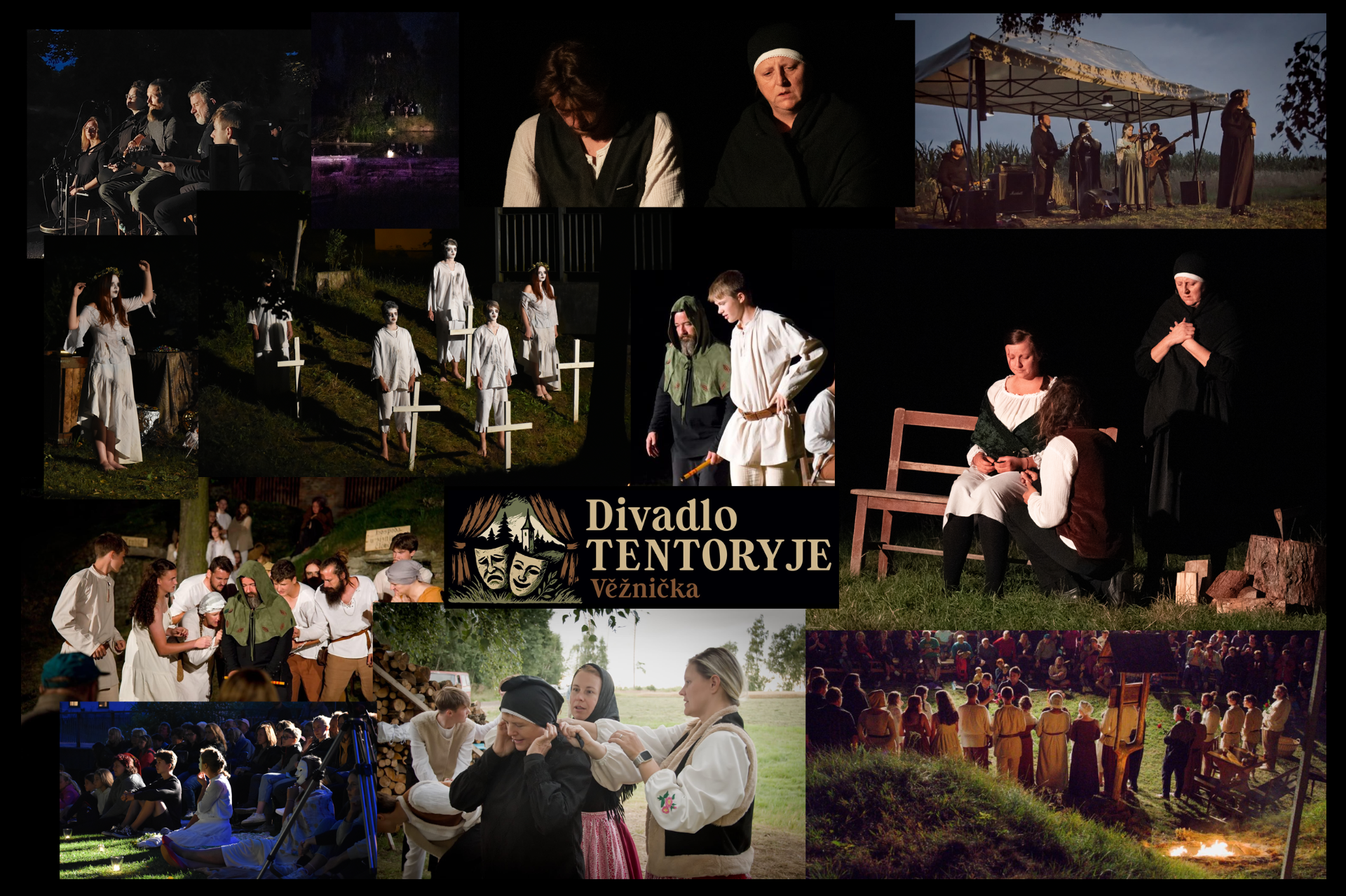 V roce 2022 se nás pár rozhodlo, že zkusíme hrát divadlo, a tak to prostě všechno začalo. V obci žije plus mínus 140 obyvatel, a my dnes už můžeme směle říct, že na našich představeních se (přímo či nepřímo) podílí takřka třetina obyvatel. Do roku 2024 jsme hráli jen tak, pod názvem Věžnička hraje divadlo, ale okolnosti nakonec vedly k založení spolku, pro který jsme vybrali název „Divadlo Tentoryje“.
